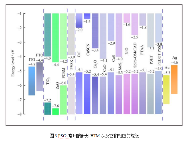 除了上述有機類HTL材料外,Cu2O、CuO、CuI、CuSCN、NiOx、MoS2等無機HTL也得到廣泛研究,并表現(xiàn)出優(yōu)異的性能。此外,Cu、CuCrO2、MoOx、WOx也有報道。其中,NiOx是p-i-n型PSCs中最常用的無機HTL材料。這些HTL和其他常用材料在PSCs中的能級如圖3所示。