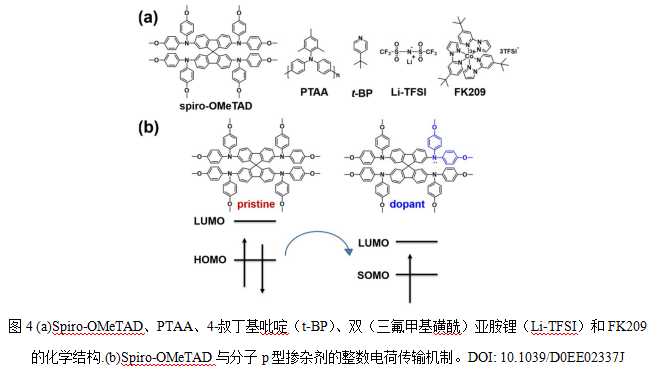 在有機材料領域,Spiro-MeOTAD作為HTM應用于正式PSCs的制備已引起了廣泛關注。然而,由于氧化態(tài)不足,直接使用Spiro-OMeTAD會使PCE表現(xiàn)不佳。采用Spiro-MeOTAD制備的鈣鈦礦太陽能電池器件需通過額外的氧化工藝才能獲得理想的光伏性能。