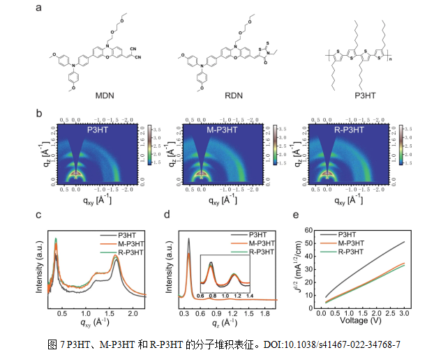 P3HT同樣具有較高的空穴遷移率,能夠有效地傳輸空穴,減少復合損失,并有良好的柔韌性和溶液加工性,適用于柔性基底和大面積器件的制備。Xu等通過構(gòu)建分子橋MDN來改善P3HT與鈣鈦礦之間的接觸。MDN通過馬來酰亞胺基團與鈣鈦礦表面的Pb2+離子形成靜電耦合,同時其三苯胺基團與P3HT形成緊密的π-π堆疊,在鈣鈦礦與P3HT之間構(gòu)建電荷傳輸通道。這不僅改善了界面接觸,還鈍化了鈣鈦礦表面的缺陷,減少了復合,提高了電池的效率和穩(wěn)定性。