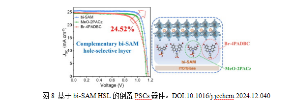 SAM分子主要由錨定基團、連接基團和端基組成,通過引入各種官能團或原子調(diào)整表面能級、減少界面缺陷,實現(xiàn)其對鈣鈦礦層的修飾達到提升鈣鈦礦薄膜質(zhì)量和防止器件退化的效果。Zhang等將Br-4PADBC作為輔助組分引入到MeO-2PACz的SAM中,形成互補的雙組分SAM(bi-SAM),增強倒置PSCs的空穴傳輸能力。Br-4PADBC的非平面DBC核心和兩個Br原子是創(chuàng)新的關鍵。非平面結(jié)構(gòu)增加了分子的偶極矩,顯著提高ITO的功函數(shù),實現(xiàn)了與鈣鈦礦價帶能級更好地對齊。Br原子的引入不僅增強了與未配位Pb2+離子的配位相互作用,改善了鈣鈦礦薄膜的結(jié)晶質(zhì)量,還有效鈍化了鈣鈦礦的缺陷,減少了非輻射復合。將Br-4PADBCMeO-2PACz 結(jié)合形成的bi-SAM,不僅保留了MeO-2PACz的高電導率,確保了高效的空穴提取,還通過Br-4PADBC的高偶極矩進一步優(yōu)化了能級對齊。