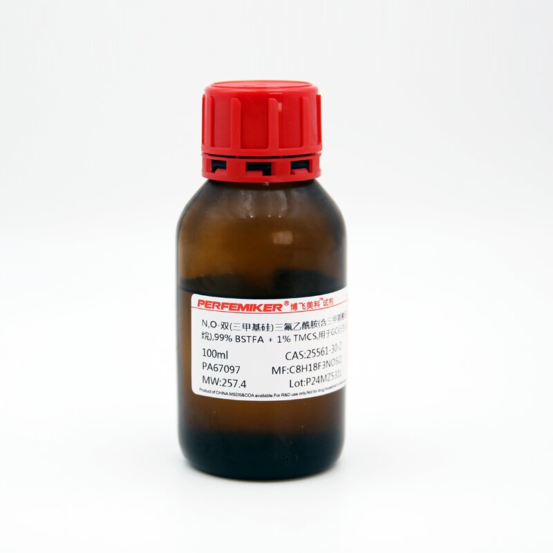 博飛美科的N,O-雙(三甲基硅)三氟乙酰胺(含三甲基氯硅烷),99% BSTFA + 1% TMCS,用于GC衍生化為衍生化試劑,產(chǎn)品穩(wěn)定,定制速度快,極大地方便了廣大科研客戶的使用需求。產(chǎn)品包裝為500ml。查詢關(guān)鍵詞:衍生化試劑,25561-30-2,N,O-雙(三甲基硅)三氟乙酰胺(含三甲基氯硅烷),99% BSTFA + 1% TMCS,用于GC衍生化,N,O-Bis(trimethylsilyl)trifluoroacetamide with trimethylchlo